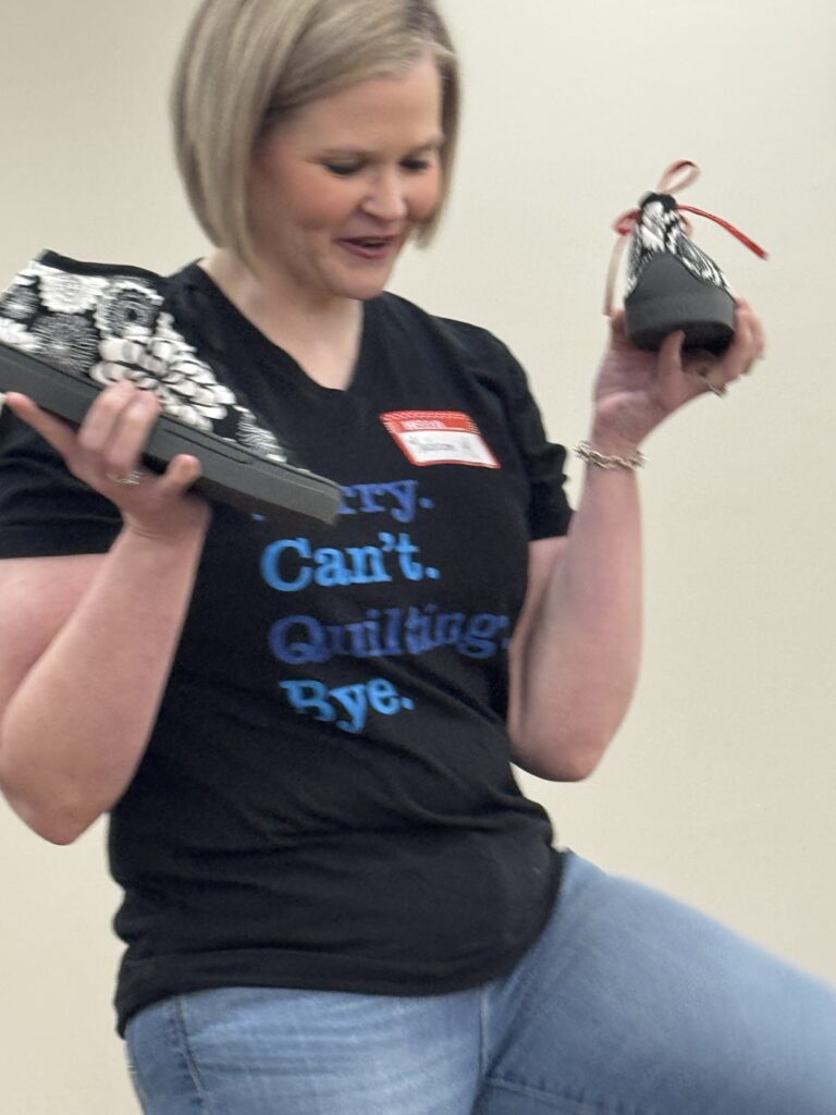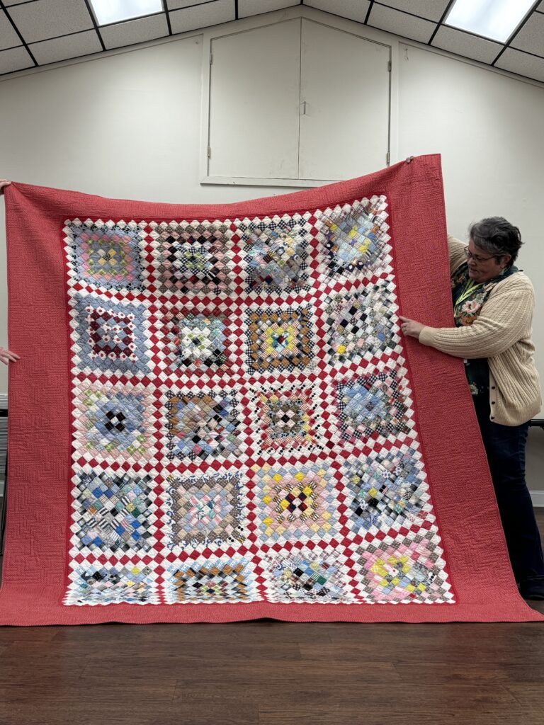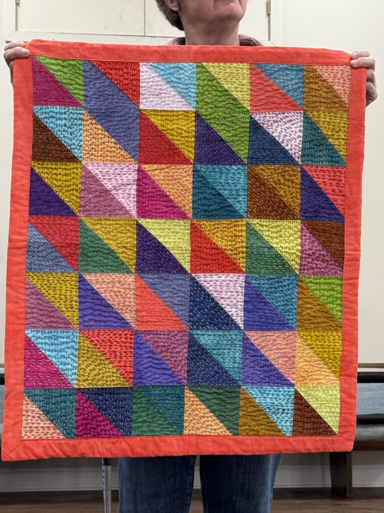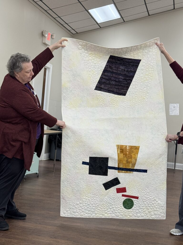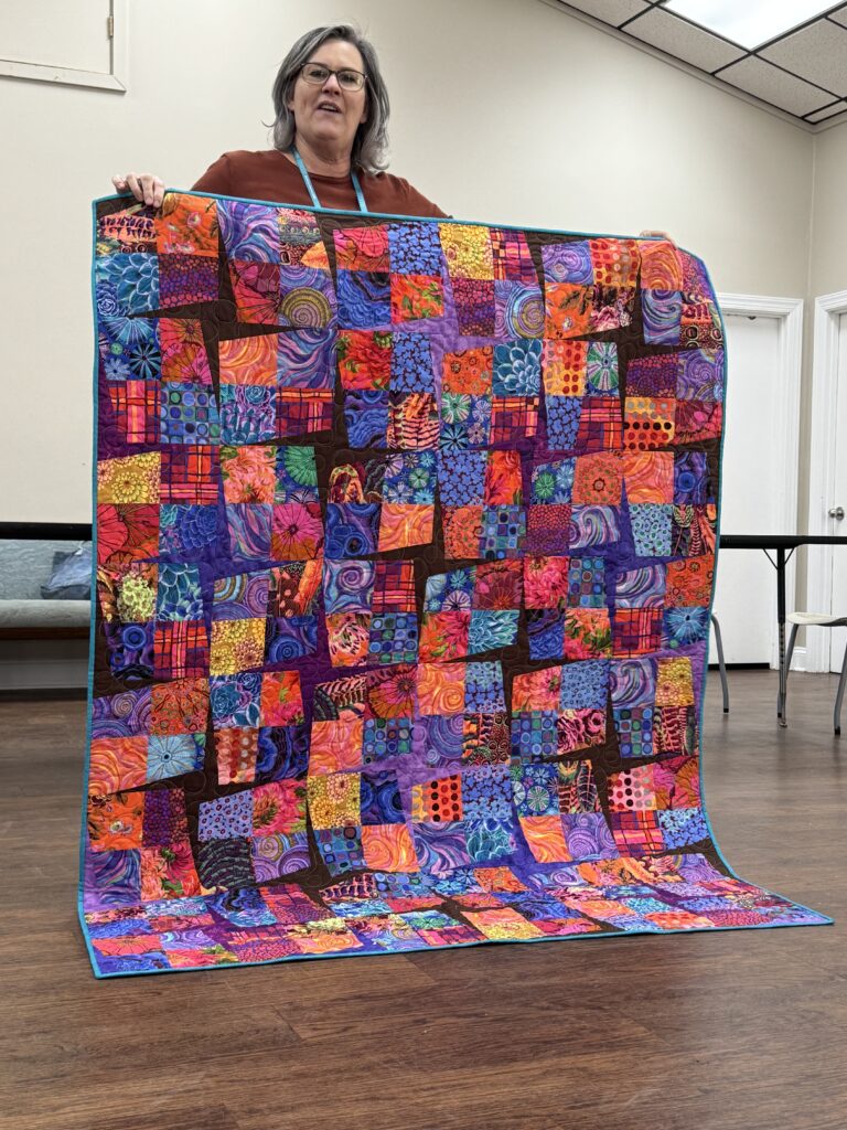 - Philanthropy – Diane Kent: Diane shared a free pattern from Fat Quarter Shop for philanthropy quilts that can be made from 2 Charm Packs. She also shared tips for completing the binding using a serpentine stitch. Each of our charities needs 10 quilts (for a total of 20) by the end of the quarter, and we are on track to make those numbers in time for the March delivery. (Pattern can be found here: https://
