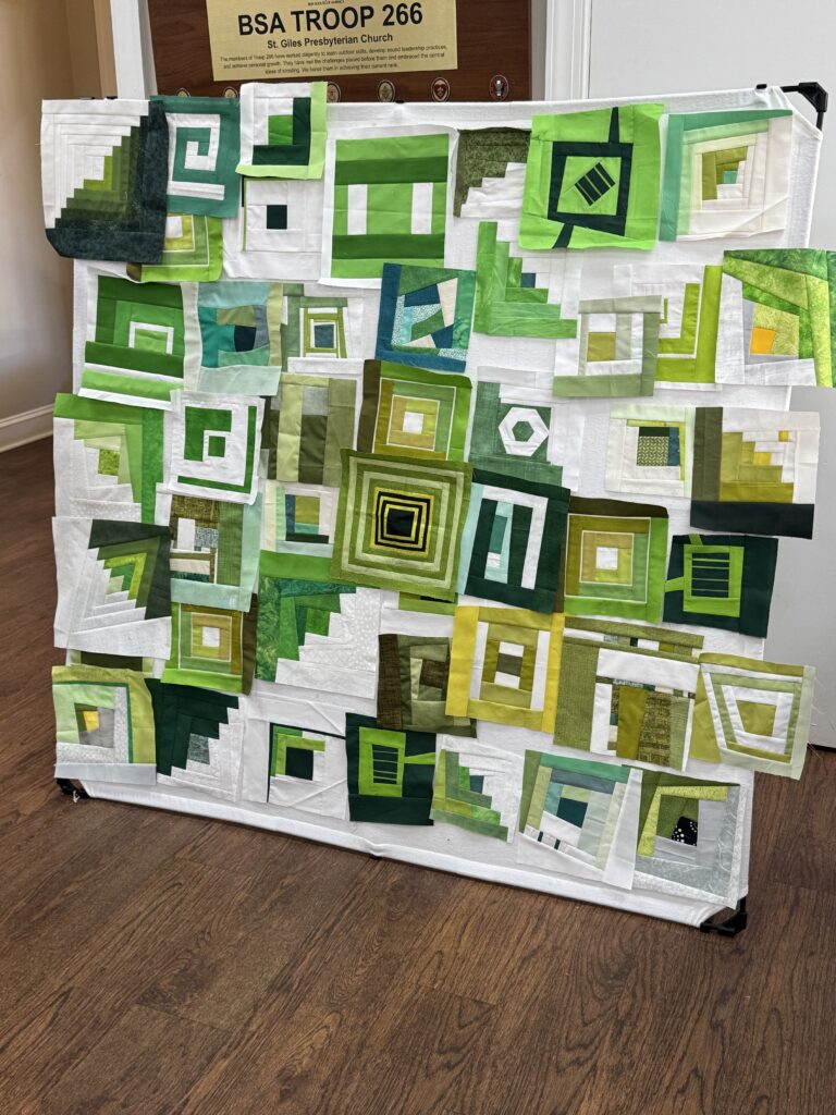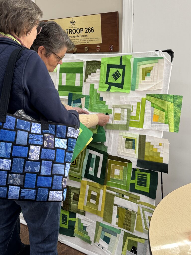 - Programs – Diana Pickens: Winter Challenge: 71 improv blocks using green and white in a log cabin style were collected at the meeting. Raffle tickets were given for each block. The variety of styles, sizes, and innovations were extraordinary. Charity quilts will be made from the contributed blocks.